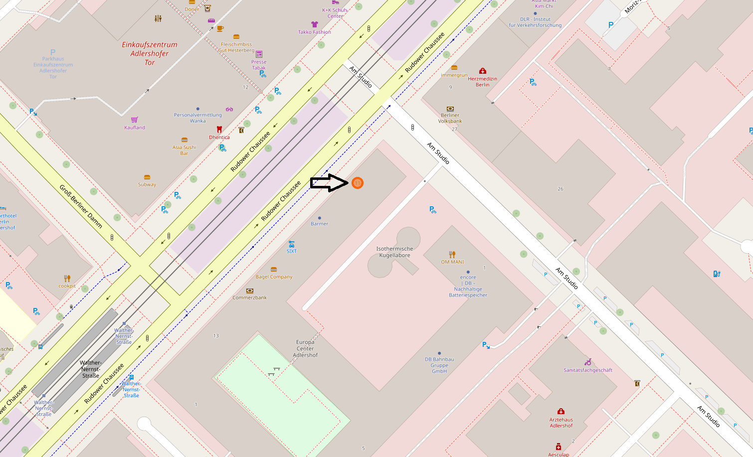 Wenn Sie mit dem Auto anreisen, nehmen Sie von der Autobahn A113 die Ausfahrt Adlershof und folgen der Rudower Chaussee in Richtung Zentrum Adlershof. Nach wenigen Minuten erreichen Sie die Kreuzung Rudower Chaussee / Groß-Berliner Damm. Der Standort befindet sich kurz hinter dieser Kreuzung auf der rechten Seite, direkt gegenüber vom Einkaufszentrum Adlershofer Tor. Parkmöglichkeiten finden Sie in den umliegenden Parkhäusern.