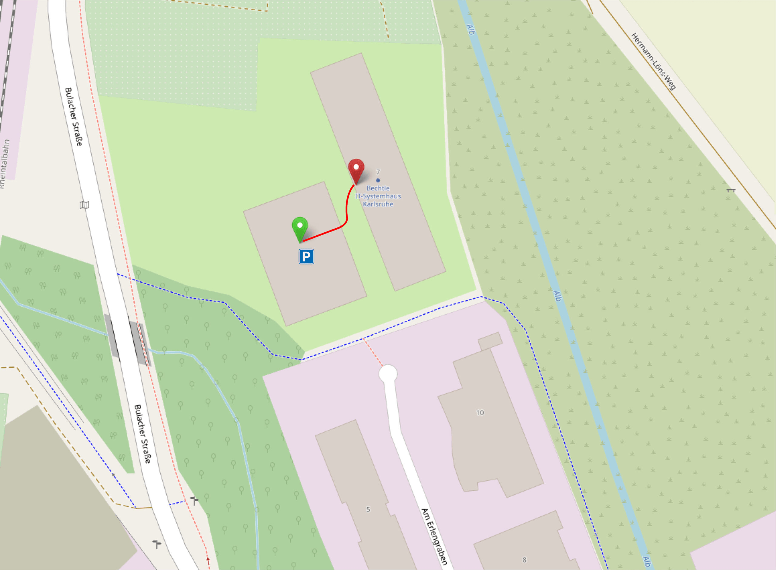 Wenn Sie mit dem Auto anreisen, steht Ihnen ein Parkhaus zur Verfügung (grüner Pin). Von dort erreichen Sie das angrenzende Gebäude ganz unkompliziert über den markierten Weg (rote Linie) und gelangen direkt zum Haupteingang (roter Pin).