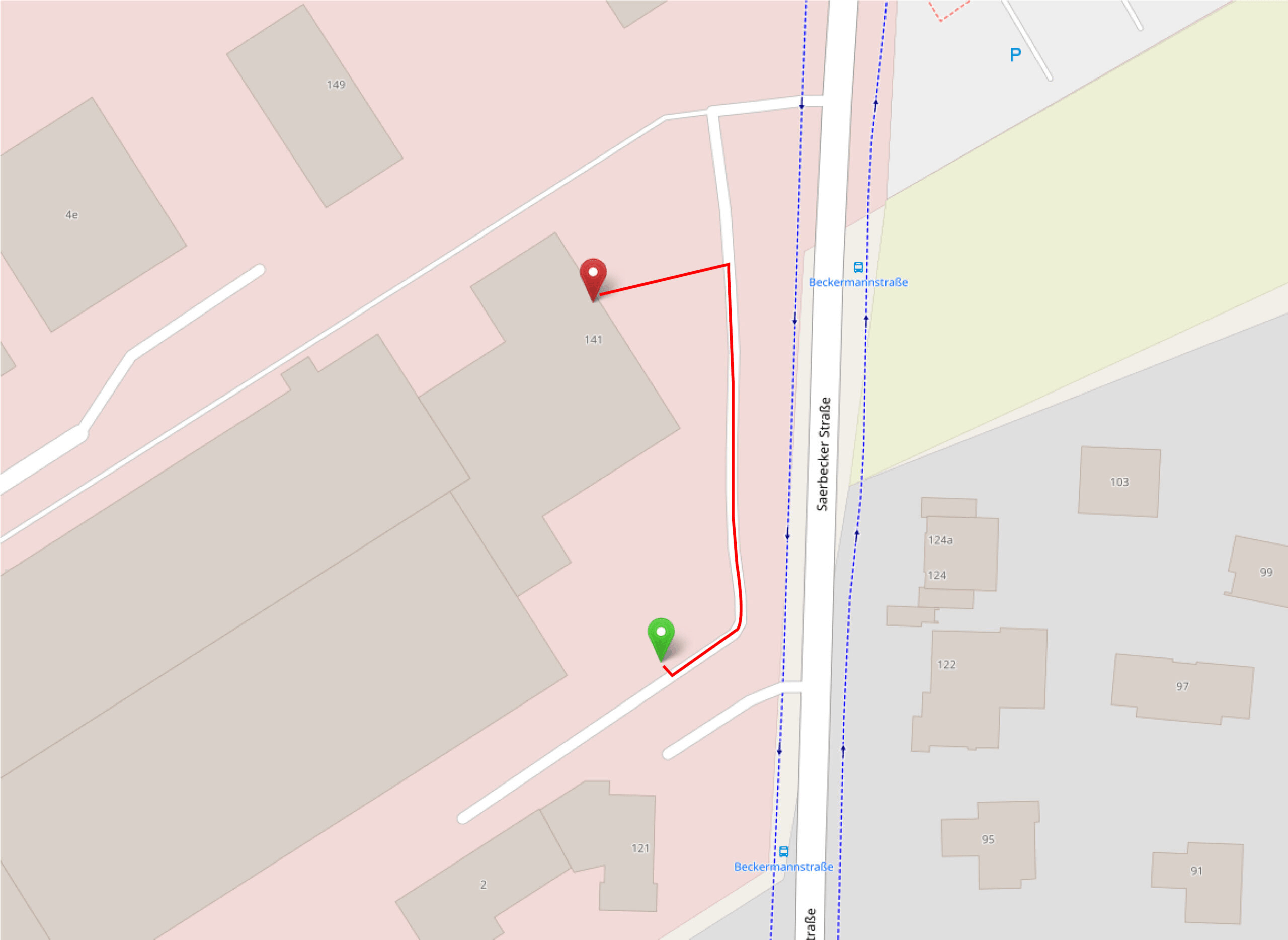 Wenn Sie mit dem Auto anreisen, stehen Ihnen Parkplätze am hinteren Bereich des Geländes zur Verfügung (grüner Pin). Von dort folgen Sie dem Weg zurück (rote Linie), biegen vorne links ab und gelangen direkt zum Haupteingang (roter Pin).