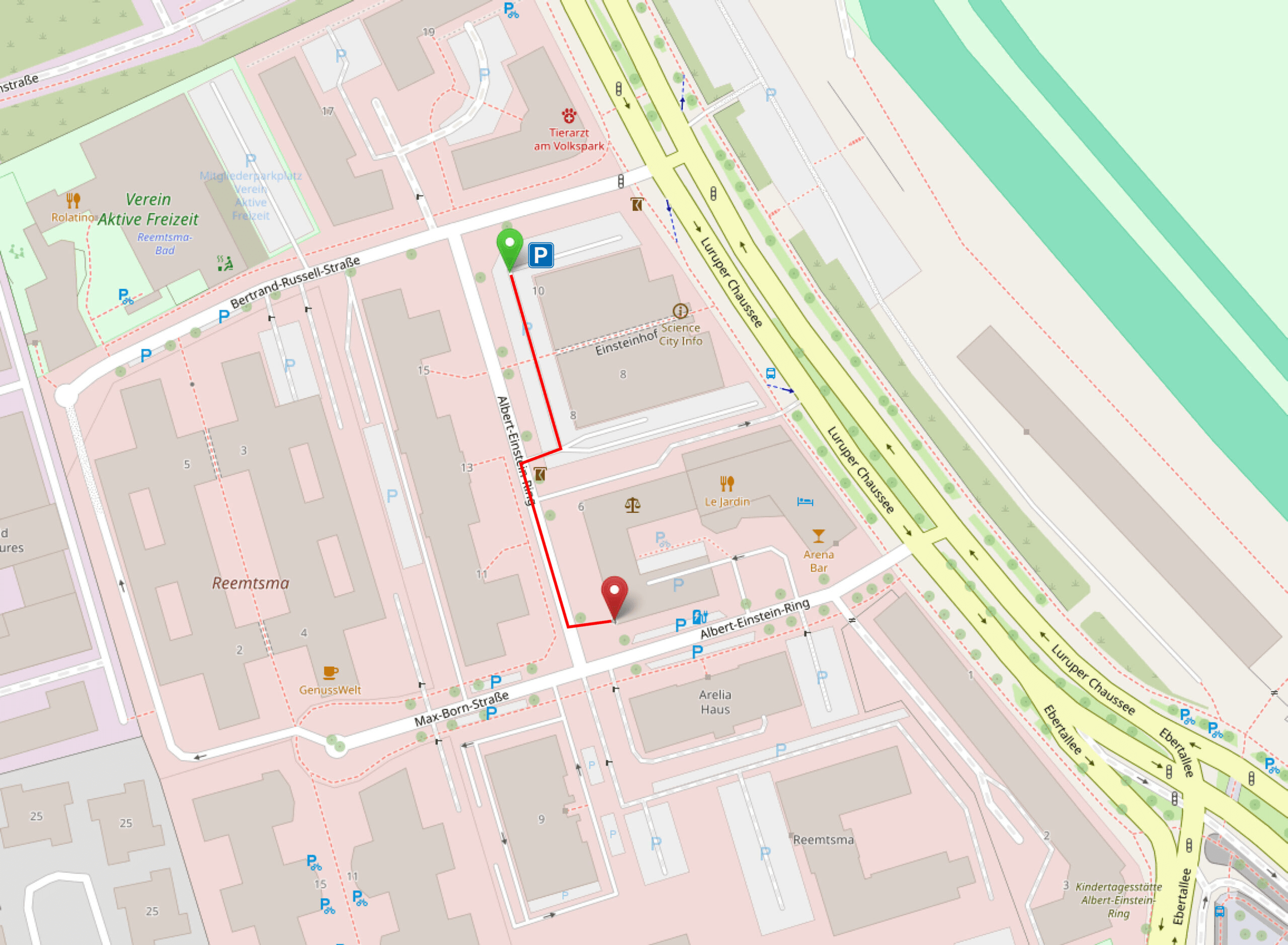 Wenn Sie mit dem Auto anreisen, stehen Ihnen hinter dem Gebäude – neben der Zahnarztpraxis – Parkplätze zur Verfügung (grüner Pin). Von dort aus folgen Sie der „Albert-Einstein-Ring“-Straße in südlicher Richtung (rote Linie), biegen kurz vor der Straßenecke links ab und gelangen direkt zum Haupteingang (roter Pin).