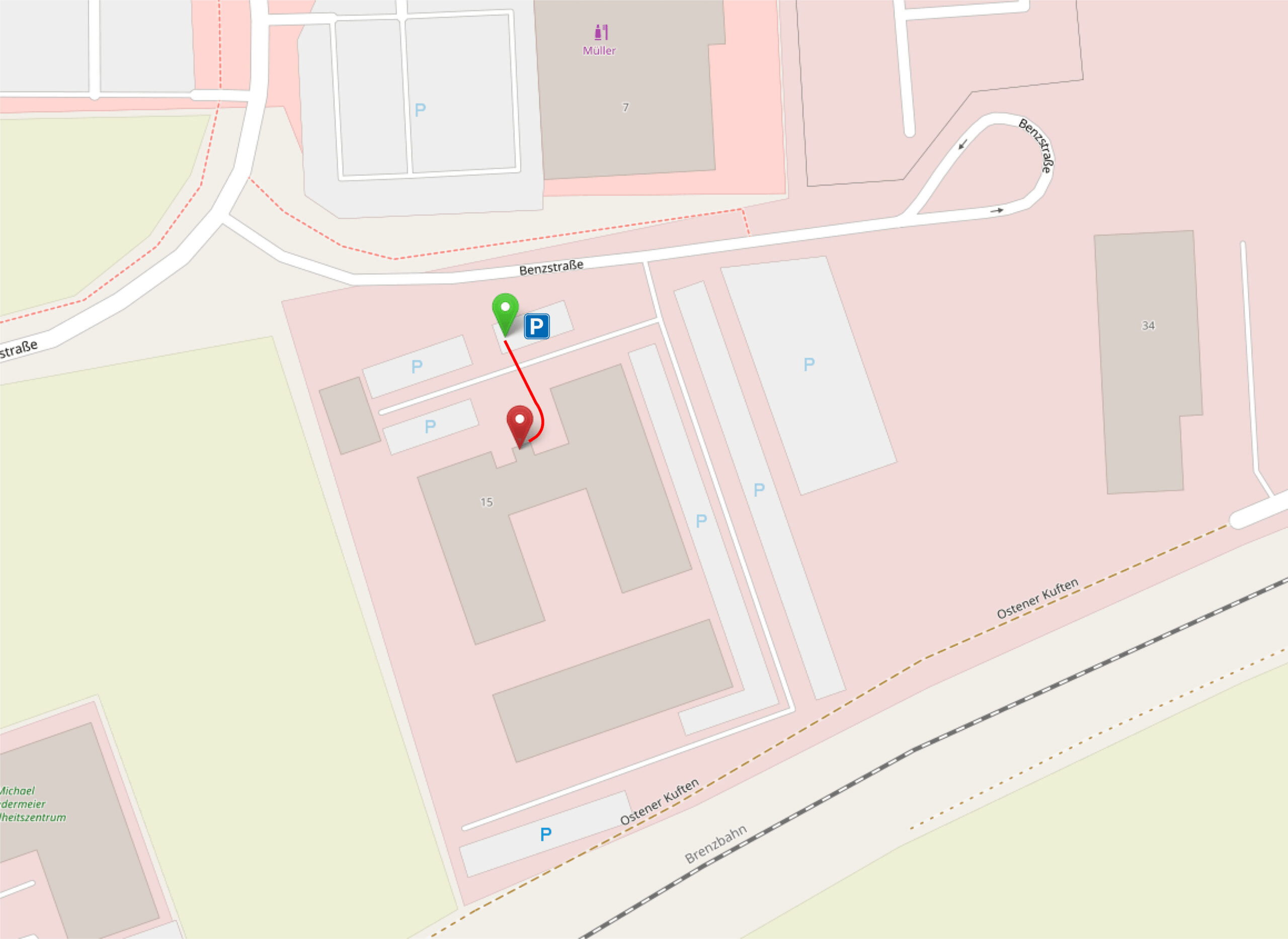 Wenn Sie mit dem Auto anreisen, stehen Ihnen Parkplätze in unmittelbarer Nähe zum Gebäude zur Verfügung (grüner Pin). Von dort aus folgen Sie dem Weg in Richtung Hauptgebäude (rote Linie). Der Eingang befindet sich ganz in der Nähe der Parkplätze und ist gut sichtbar gekennzeichnet (roter Pin).