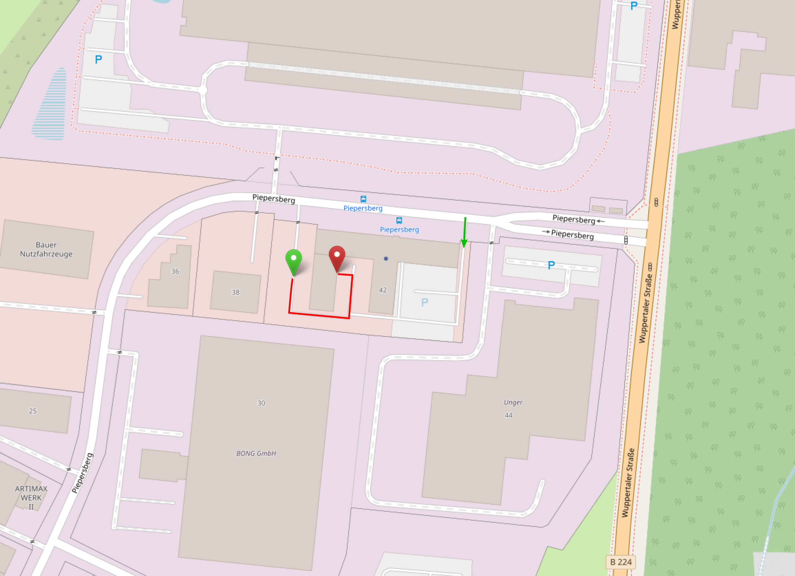 Wenn Sie mit dem Auto anreisen, stehen Ihnen Parkplätze auf unserem Gelände zur Verfügung (grüner Pin). Fahren Sie hierzu von der „Wuppertaler Straße (B224)“ auf die Straße „Piepersberg“ und nehmen Sie direkt die erste Einfahrt zu unserer Geschäftsstelle (grüner Pfeil). Anschließend folgen Sie dem in der Skizze rot markierten Weg, um den Haupteingang zu erreichen (roter Pin).
