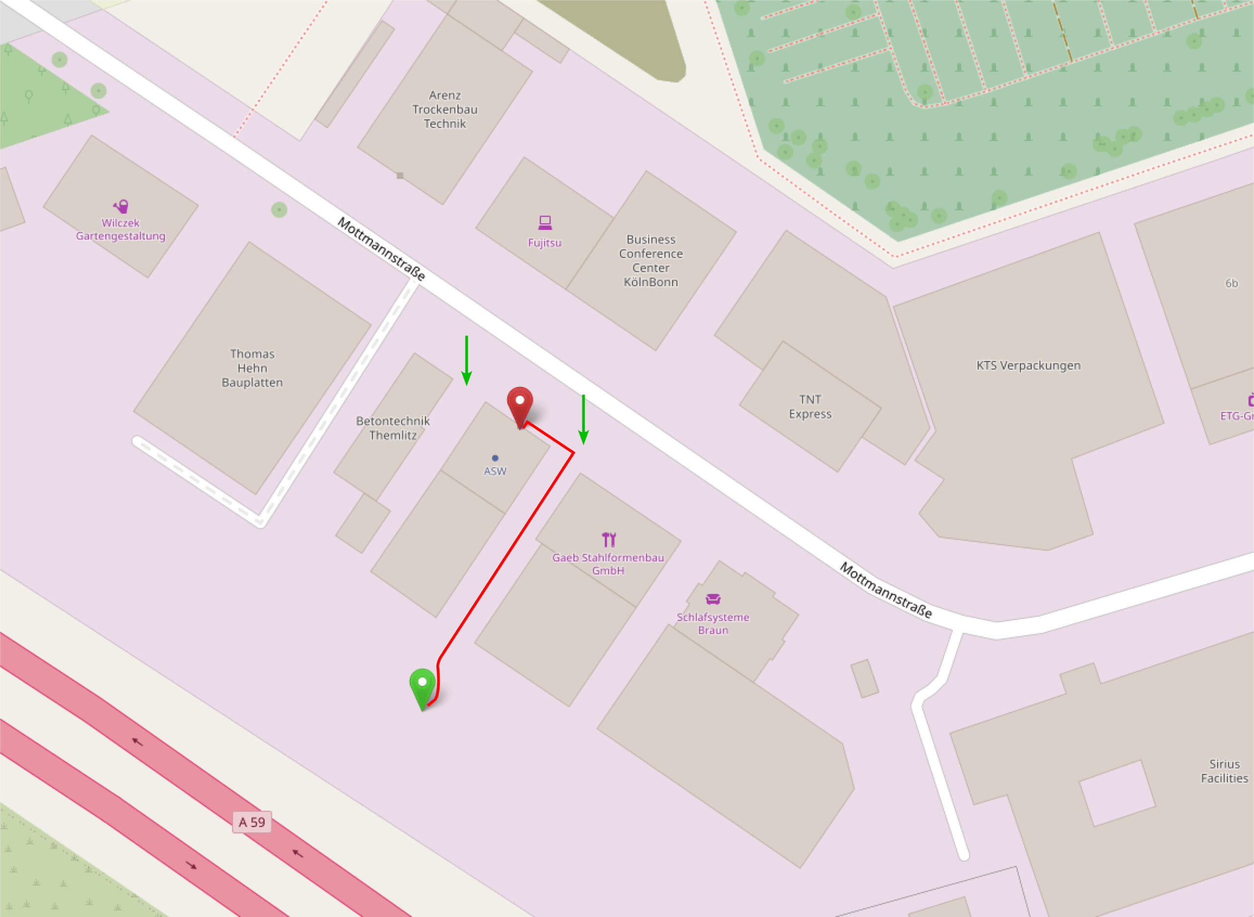 Wenn Sie mit dem Auto anreisen, stehen Ihnen hinter der Geschäftsstelle Parkplätze zur Verfügung (grüner Pin). Diese sind über zwei Einfahrten erreichbar (grüne Pfeile). Vom Parkplatz aus orientieren Sie sich zurück in Richtung Straße, um zur Vorderseite des Gebäudes zu gelangen. Der Haupteingang befindet sich dort und ist gut erkennbar (roter Pin).
