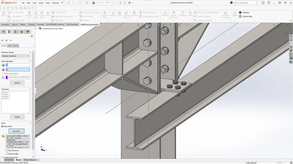 Im Bereich der manuellen Verschraubungen wurde die Mehrfachauswahl von Bauteilen erweitert. Bohrungen lassen sich nun auf Basis einer Lochskizze automatisch auf Flächen erzeugen, was die manuelle Verschraubung noch effizienter macht.