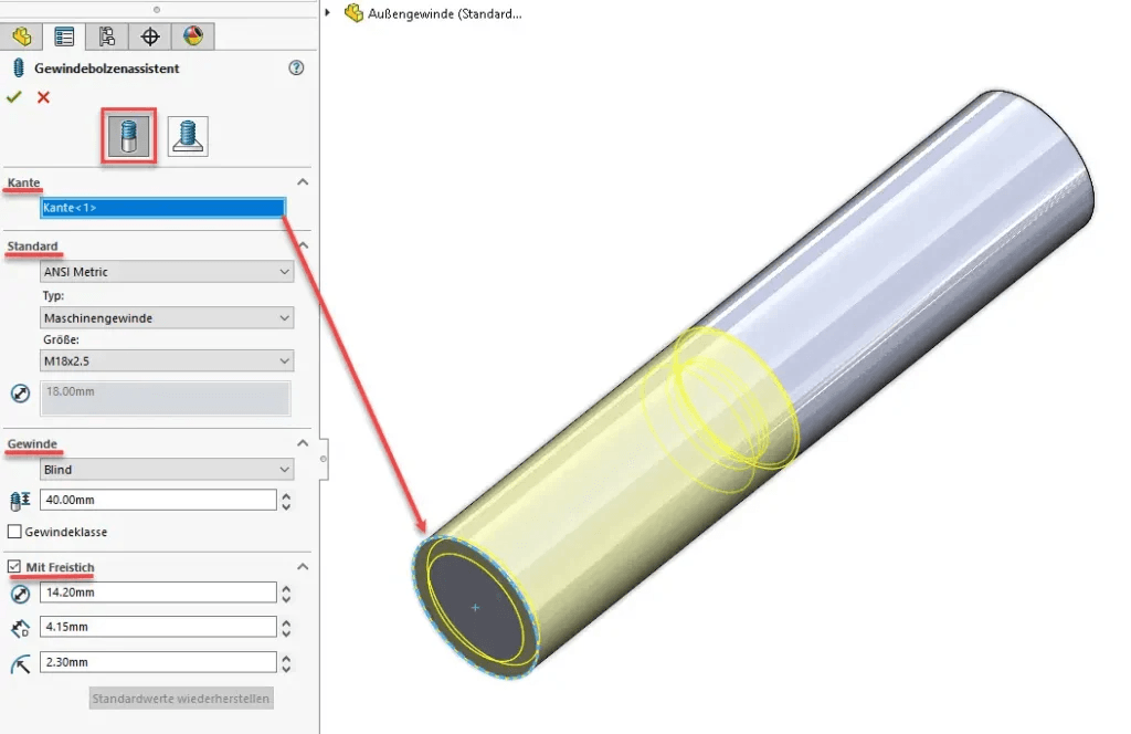 Außengewinde mit dem Feature Gewindebolzenassistent.