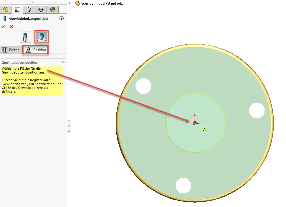 Nachdem der Bolzen definiert wurde, wechseln Sie zum Reiter Position, um anzugeben, wo der Bolzen auf der Fläche platziert werden soll.