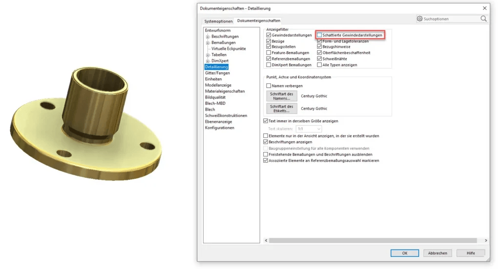 Wenn das Gewinde im Grafikbereich nicht sichtbar ist, liegt es an den Einstellungen im Bereich der Dokumenteigenschaften. Setzen Sie den Haken bei „Schattierte Gewindedarstellungen“ im Bereich „Anzeigefilter“ unter „Detaillierung“, wird es Ihnen angezeigt.