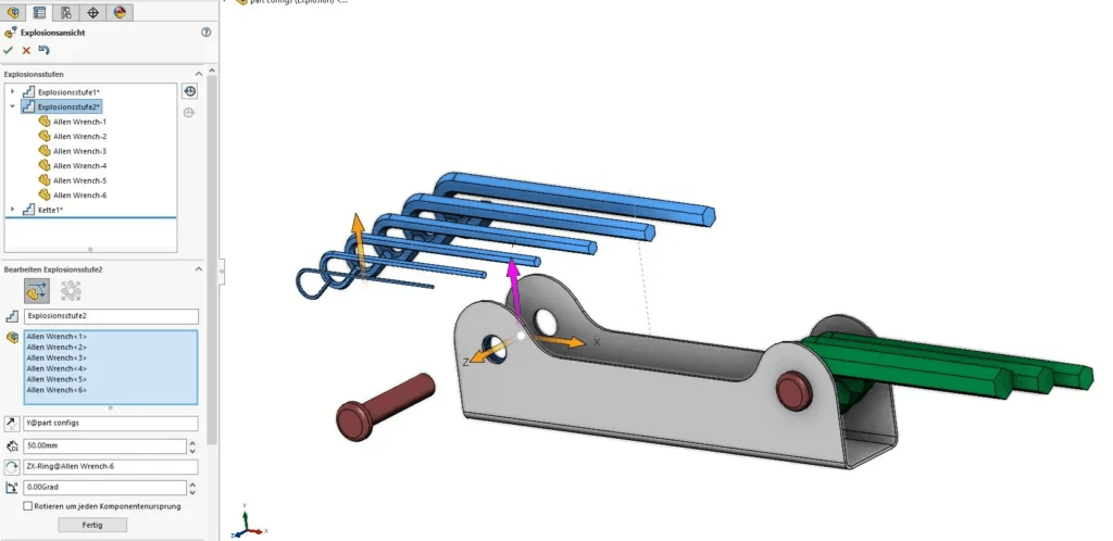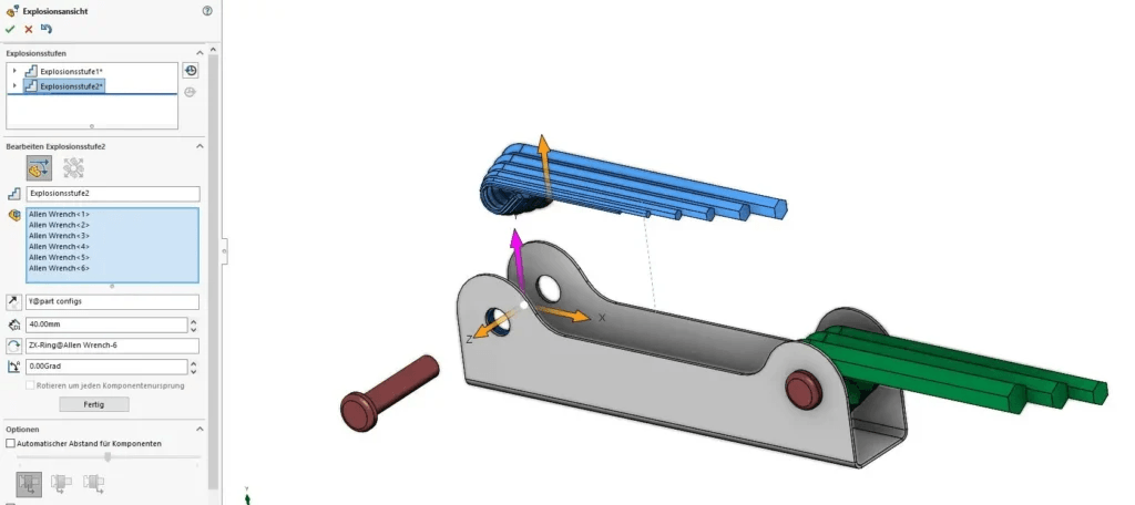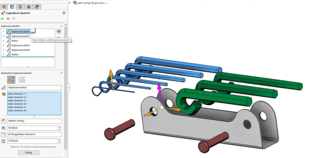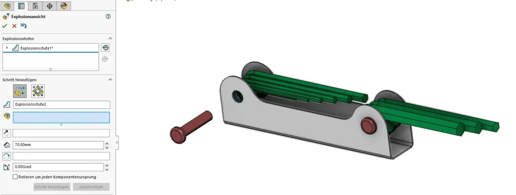 Um eine komplette Explosionsansicht des Modells zu erstellen, wird diese Vorgehensweise mehrfach wiederholt. Dabei ist ganz wichtig, dass Sie oben im FeatureManager erst auf OK klicken, wenn alle Explosionsstufen erstellt wurden.