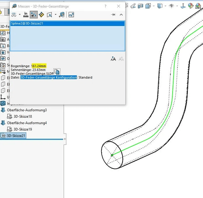 Wie kann man mit einfachen Mitteln die Gesamtlänge einer Feder in SOLIDWORKS ermitteln? Theoretisch wäre eine klassische Berechnung möglich. Jedoch wäre es bei dieser Form/Geometrie der Feder recht aufwändig, da die Feder nicht konstant in ihrer Geometrie ist.