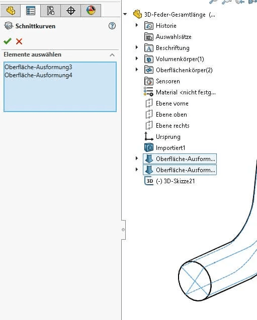 Klicken Sie erneut auf 3D Skizze. Im Anschluss wählen Sie unter Extras/Skizzieren den Befehl Schnittkurve. Als Elemente wählen Sie die beiden ausgeformten Oberflächen aus.