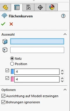 Für beide Richtungen wählen Sie 4 für die Anzahl der Kurven. Als Fläche klicken Sie auf die Oberfläche der Feder. Die Option Netz muss ausgewählt sein. Weiterhin sollte in den Optionen bei „Ausrichten auf Modell erzwingen“ der Haken gesetzt sein.