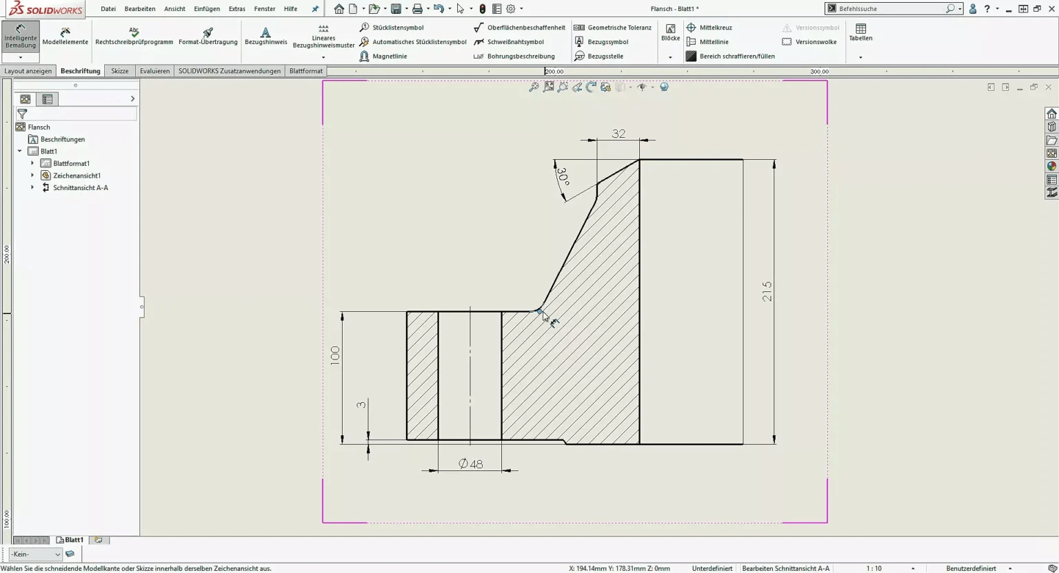 Wollten Sie auch schon mal einen Abstand zu einer Ecke bemaßen, die es durch das Anbringen eines Radius nicht mehr gibt? In der Skizze eines Bauteils ist dies kein Problem, da SOLIDWORKS hier beim Erstellen des Radius automatisch einen Eckpunkt erstellt, wo die Linien sich ursprünglich getroffen haben. In diesem Beitrag möchten wir Ihnen zeigen, wie Sie einen solchen „theoretischen Eckpunkt“ ganz einfach in Ihrer SOLIDWORKS Zeichnung bemaßen können, ohne umständlich mit selbst hinzugefügter Geometrie arbeiten zu müssen.