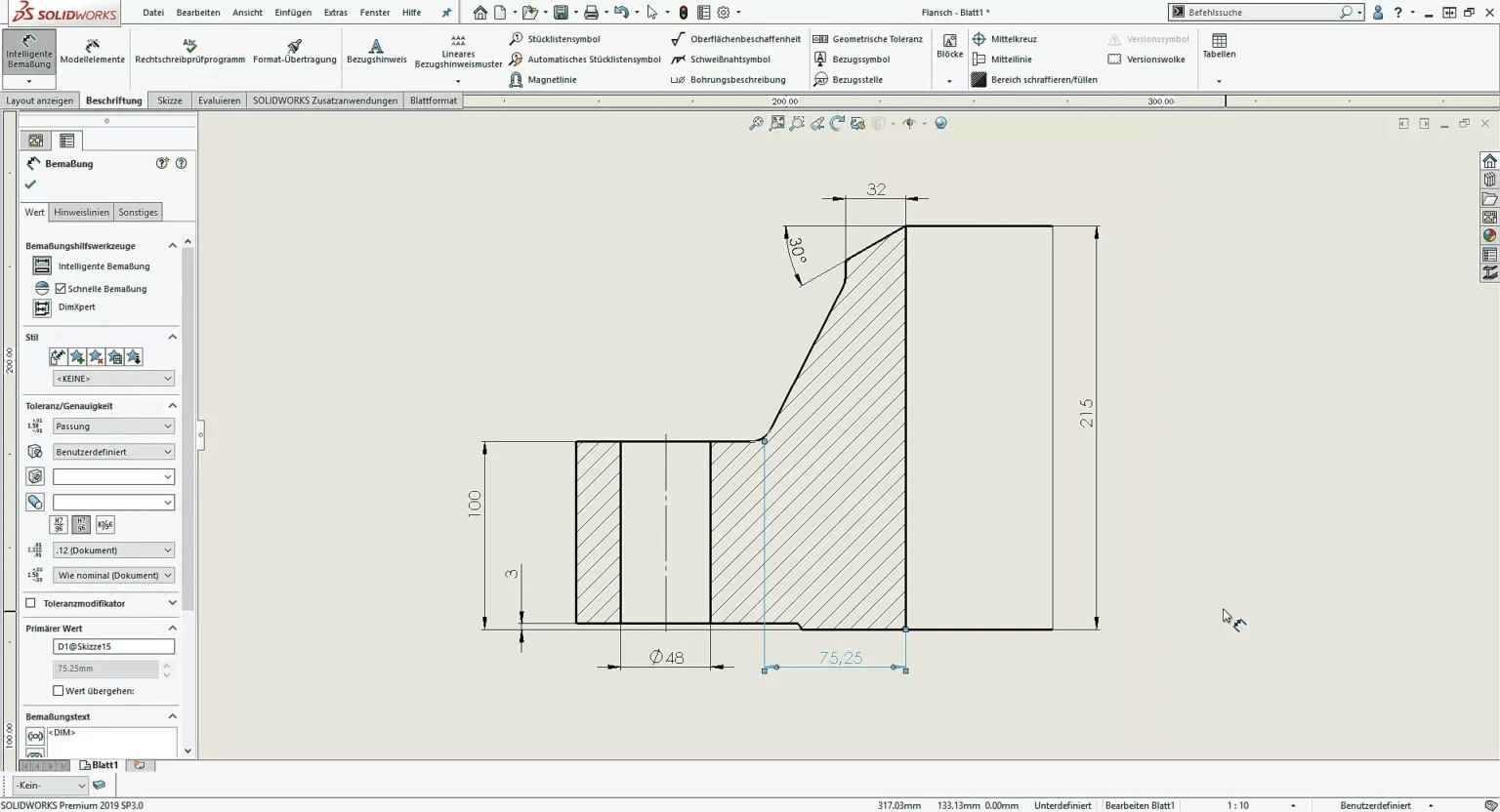 SOLIDWORKS: Mit dem theoretischen Eckpunkt vermaßen.