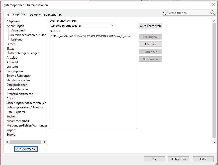 Ist dies der Fall, so wird es sich um einen Fehler in den Dateipositionen handeln. Öffnen Sie die Optionen > Systemoptionen und wählen Sie den Punkt „Dateipositionen“ aus. In dem Fly-out-Menü finden Sie die Auswahl „Symbolbibliotheksdatei“. Hier wird ein Dateipfad aufgeführt. Standardmäßig lautet dieser: C:\ProgramData\SolidWorks\SOLIDWORKS 20XX\lang\german. Möglicherweise wird hier noch auf die alte SOLIDWORKS Version verwiesen.