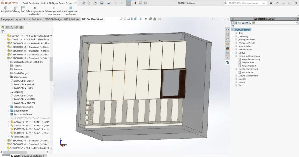 Auf die Frage, was sich seit dem Einsatz von SWOOD verbessert habe, antwortet Johannes Bittl gleich: „Das Programm ist der Wahnsinn. Durch SWOOD sind Arbeitsabläufe schneller, genauer und es werden Fehler besser vermieden. Wenn ein Schrank zum Beispiel fertig geplant ist, besteht die Möglichkeit eine Stückliste auszudrucken und somit weiß man gleich was benötigt wird.“ Die Softwarelösung SWOOD ist speziell für holzverarbeitende Betriebe wie Schreinereien, Möbel- und Innenausbauer entwickelt und ermöglicht effizientes Arbeiten, vom Design bis zur Fertigung. „Wir arbeiten mit SWOOD, weil es einfach genau auf unseren Betrieb zugeschnitten ist. Es ist sehr vielseitig und passt perfekt zu uns“, sagt der Chef erfreut. Johannes Bittl nutzt häufig die ,Bibliothek‘ in SWOOD. DPS hat die Lösung ideal auf die Erfordernisse seiner Schreinerei angepasst: „Die Masken sind eigens für uns angelegt worden. Hier sind bestimmte Grundkorpusse hinterlegt, die von den Grundmaßen variabel sind und das erleichtert das Arbeiten enorm.“