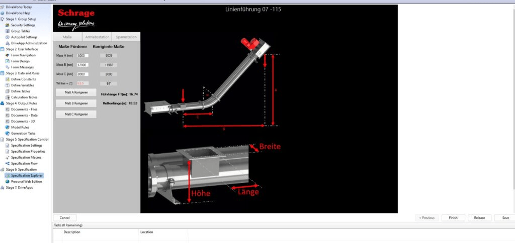 Zeitgleich zu der Implementierung von SOLIDWORKS Composer und SOLIDWORKS Visualize kam der Wunsch auf, Zeichnungen in der Angebotsphase schneller erstellen zu können. Gleichzeitig sollte die Konstruktionsabteilung entlastet werden. „Wir erstellen ungefähr 1.000 Angebotszeichnungen im Jahr, ganz viele davon mit den einfachsten Linienführungen. Also ein waagerechter oder ein vertikaler Förderer mit unterschiedlichen Maßen. Das immer wieder zu zeichnen, ist wenig herausfordernd. Und man kann es automatisieren.“, beschreibt Jann Evers die Motivation, nach einer Lösung zur Konstruktionsautomatisierung zu suchen. Über die Eingabe weniger Variablen in einer Eingabemaske soll eine Zeichnung generiert werden, die für die Angebote und später auch die Kalkulation verwendet werden kann. Für diese Aufgaben hat Schrage DriveWorks erworben. Die CPQE-Lösung kann direkt mit SOLIDWORKS Daten „gefüttert“ werden und erstellt anhand von Master-Modellen und hinterlegten Konstruktionsregeln automatisiert 3D-Modelle, Zeichnungen und Kalkulationen.
