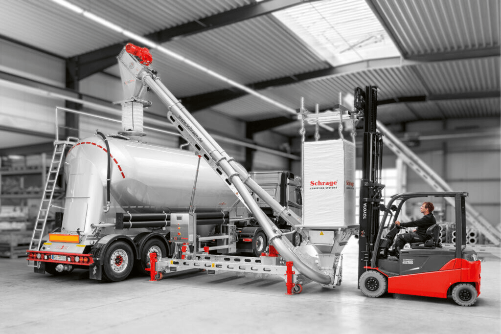 Die mobilen Rohrkettenförderer von Schrage werden überall eingesetzt, wo Schüttgüter flexibel umgeladen werden müssen. Das Verladen von Produkten, beispielsweise aus Bigbags in LKW, wird so schneller, sauberer und sicherer.